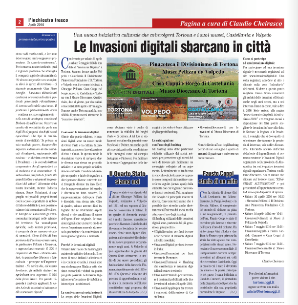 Questi tre articoli che seguono sono stati pubblicati sul numero di Aprile 2016 de “l’inchiostro fresco“. Con i Titoli: “Le Invasioni digitali sbarcano in città“; “Il Quarto Stato siamo noi” e “Fausto Coppi storia di un Mito“.
